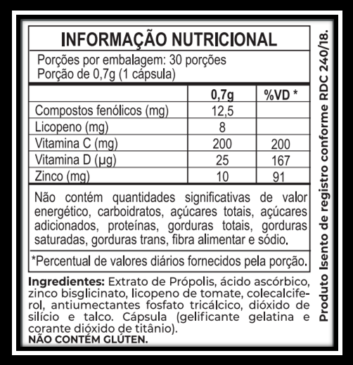 Própolis 250mg, Vitamina C 200mg, Licopeno 8mg, Vitamina D 1000UI e Zinco 10mg.