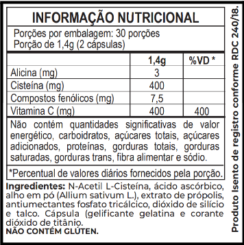 N-Acetil L-Cisteína 400mg, Vitamina C 400mg, Alho (Allium sativum L.) 300mg, Própolis verde 150mg (15mg de composto fenólico).