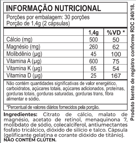 Magnésio Malato 260mg, Cálcio Citrato 500mg, Vitamina K 65mcg, Vitamina A 600mcg, Molibdênio 45mcg e Vitamina D 25mcg.